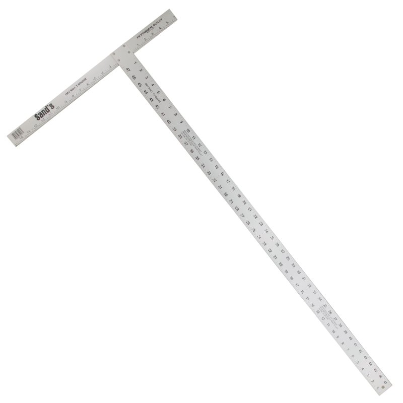 | This 48 In. T-Square is made from anodized extruded aluminum to protect the blade. Long-wearing black markings are easy to read. The reverse ruled body is easy to read from either direction. The 2 In. wide blade of the T-Square features 1/8 In. graduations for precision. The 16 In. arm and markings at 16 In. on blade makes it easy to locate studs. Notched head has a lip that rests on the edge of wallboard and drywall to easily mark for cuts. Four rivets connect the tongue and body for rugged durability and strength. Hang hole for easy storage. | |