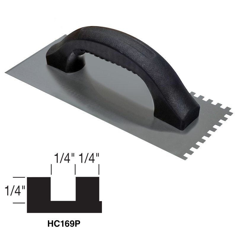 | Economy notch trowel to spread adhesives and thinset. The 1/4" x 1/4" x 1/4" square notch is great for spreading thinset for ceramic floor tile and laminated wood plank flooring applications. This 9" x 4" steel trowel blade is notched on two sides and straight on two sides. A textured plastic handle provides a comfortable grip. | |