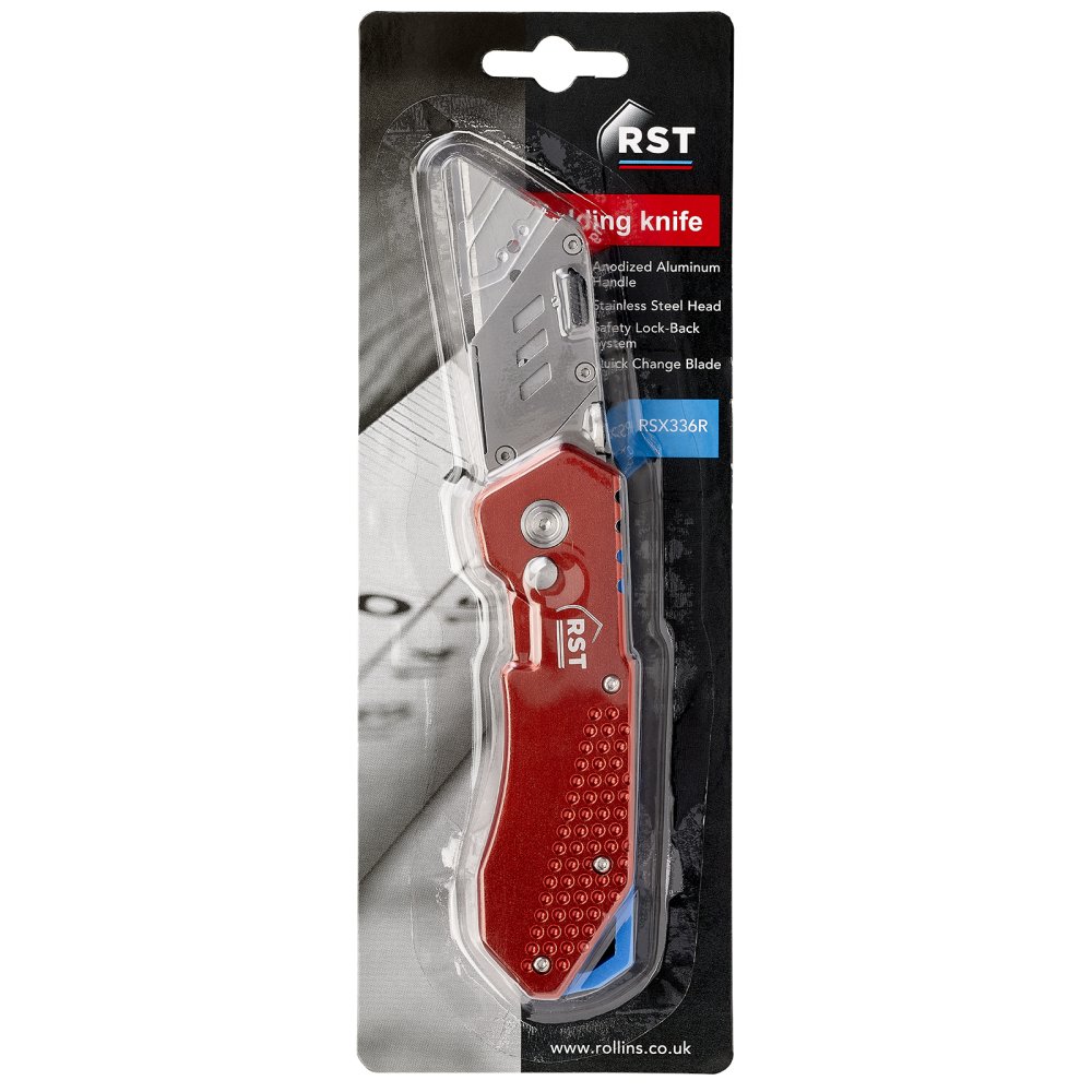 An aluminium body folding knife (red) designed with a safety lock back system to protect the blade. The blade is located in a stainless steel head & are removable and available to purchase separately.