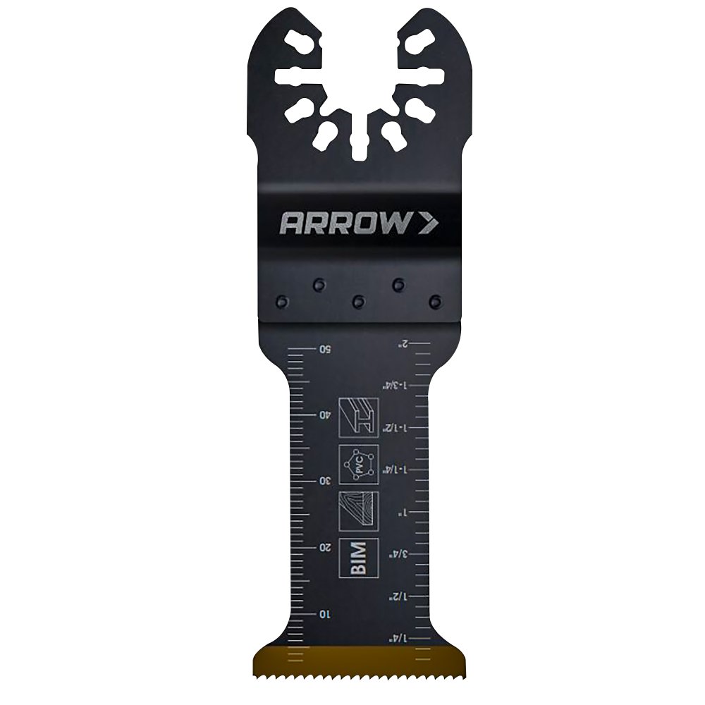 | Arrow's Titanium Coated Blade is titanium enhanced for 30% more life. The wavy tooth pattern reduces strain on individual teeth for a superior cut in a variety of non-ferrous metal profiles. This blade is perfect for use on metal (non-ferrous), wood, nails, PVC and drywall. The universal fit allows the blade to be compatible with the majority of branded oscillating saws. | |