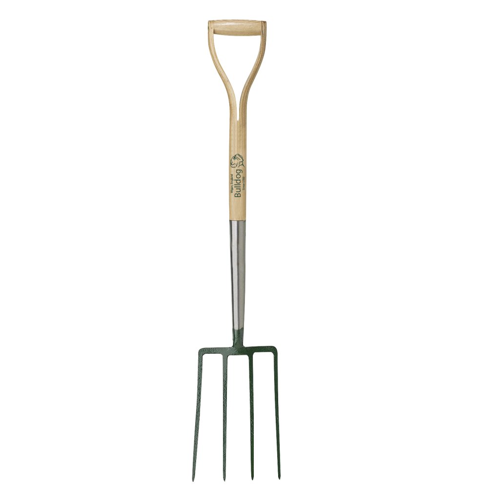 | The Bulldog Garden Fork is designed for aerating and turning soil. The diamond prongs help to provide ease of penetration particularly when working with compacted soil and breaking down lumps of soil. The 28" Ash YD handle provides a comfortable grip. The head is solid forged from one piece of steel for ultimate strength and durability and has been epoxy coated head for improved resistance to rust, scratches and alkaline in the soil. | |